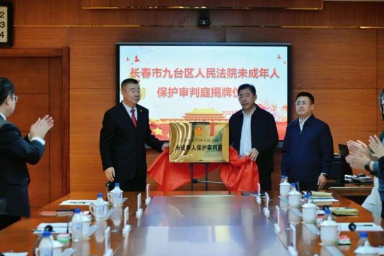 在熱烈的掌聲中,長(zhǎng)春市九臺(tái)區(qū)委常委、政法委書(shū)記孫文斌、長(zhǎng)春市九臺(tái)區(qū)副區(qū)長(zhǎng)、市公安局九臺(tái)分局局長(zhǎng)秦力民與邵杰共同為“長(zhǎng)春市九臺(tái)區(qū)人民法院未成年人保護(hù)審判庭”揭牌。