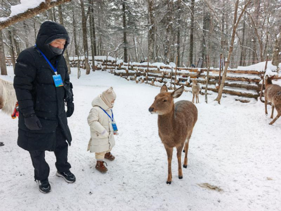 行至景區(qū)中心處的“粉雪部落”,濃郁的東北風(fēng)情撲面而來!爸侨⊥⑸健敝黝}場景成了最熱鬧的打卡點,歡聲笑語不斷。鹿園里,孩子們輕輕撫摸馴鹿、喂食苔蘚,體驗著與森林精靈親近的樂趣!霸谀戏綇臎]見過真正的馴鹿,這種體驗太難得了”,來自云南的段先生一邊錄制視頻,一邊準(zhǔn)備向家人“炫耀”這份難得的美好。