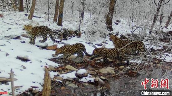 四只東北豹在林區(qū)散步。(資料圖)東北虎豹國(guó)家公園管理局供圖