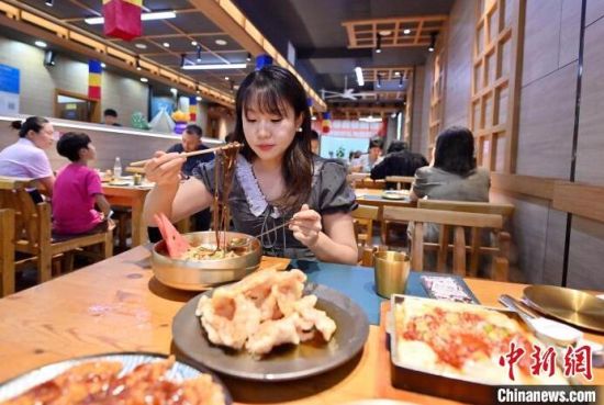 7月23日,吉林長(zhǎng)春,食客體驗(yàn)延吉冷面配鍋包肉的“冷熱配”吃法!≈行律缬浾 張瑤 攝