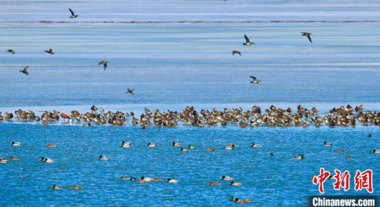 3月15日,松原查干湖候鳥(niǎo)在冰上覓食、休憩。 李鵬程 攝