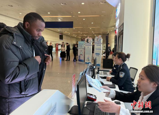 1月20日,吉林長春,外國留學(xué)生在長春龍嘉國際機(jī)場“吉便利”出入境一站式綜合服務(wù)窗口辦理相關(guān)業(yè)務(wù)。 中新社記者 張瑤 攝
