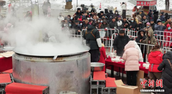 中新網(wǎng)吉林2月5日電 (記者 石洪宇)在廣場(chǎng)上架起直徑2米的大鐵鍋,柴火在灶里噼啪作響。廚師揭開(kāi)鍋蓋,熱氣蒸騰,年豬燴菜的濃香四散飄溢。