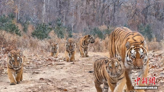 中新社長春12月26日電 (記者 郭佳)記者26日從東北虎豹國家公園管理局獲悉,今年11月8日,在公園的琿春片區(qū)監(jiān)測到一只雌性野生東北虎帶領(lǐng)五只幼崽出現(xiàn),這是中國首次拍到“六虎同框”影像。