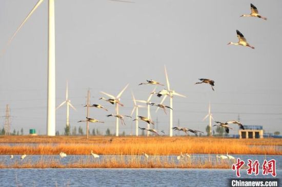 正在降落的白鶴、灰鶴。 潘晟昱 攝