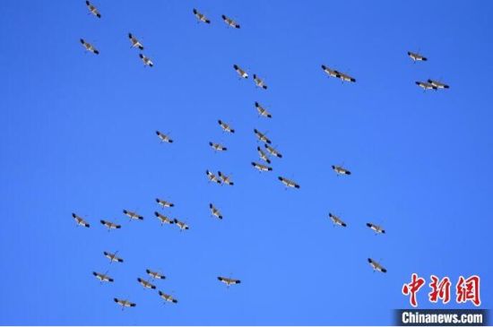 白鶴在天空翱翔。 潘晟昱 攝