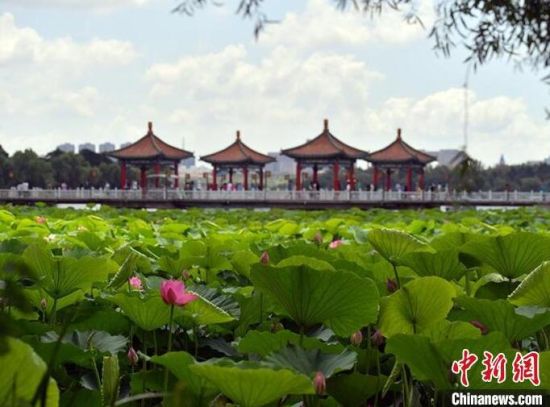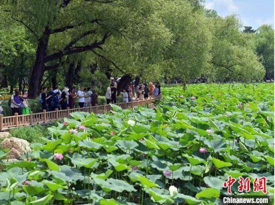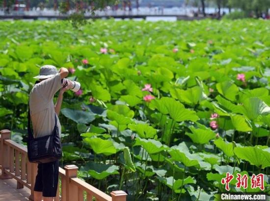 7月12日,在吉林長(zhǎng)春南湖公園荷花池內(nèi),3萬(wàn)余株荷花迎來(lái)觀賞期,放眼望去,“惟有綠荷紅菡萏,卷舒開(kāi)合任天真”的景色盡收眼底,引賞花市民駐足觀賞。(完)