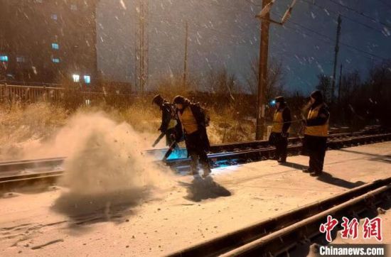 長(zhǎng)春鐵路部門(mén)連夜清雪。中國(guó)鐵路沈陽(yáng)局集團(tuán)有限公司長(zhǎng)春站供圖