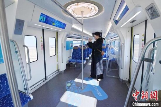 3月21日,全球首列氫能源市域列車在長(zhǎng)春進(jìn)行時(shí)速160公里滿載運(yùn)行試驗(yàn)。圖為列車車廂內(nèi)部。中新社記者 張瑤 攝