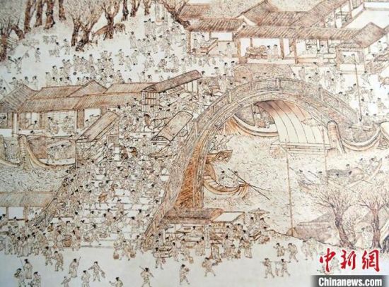 王巖正在查看作品中的細節(jié)。王巖正在創(chuàng)作烙畫作品。王巖正在創(chuàng)作烙畫作品。王巖正在創(chuàng)作烙畫作品。王巖用烙畫技術(shù)臨摹的明代清明上河圖。