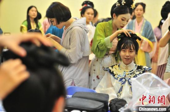 7月9日,吉林四平,2024年全國臺聯(lián)第二十一屆臺胞青年千人夏令營吉林分營的30余位臺胞青年參加傳統(tǒng)文化講座,學習漢服禮儀、漢服種類劃分等知識,并第一次穿上漢服進行體驗,感受傳統(tǒng)文化之美。圖為臺胞青年在進行漢服妝造。高龍安 攝