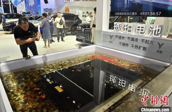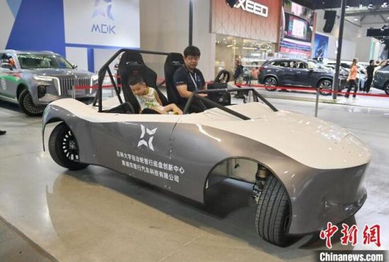 7月13日,吉林長春,參展商在展示安裝了自動(dòng)輪智行底盤汽車的原地轉(zhuǎn)向功能。在第21屆長春國際汽車博覽會(huì)上,汽車產(chǎn)業(yè)的前沿技術(shù)成果集中亮相,吸引參觀者的目光。(中新社記者 張瑤/攝)