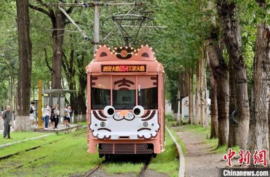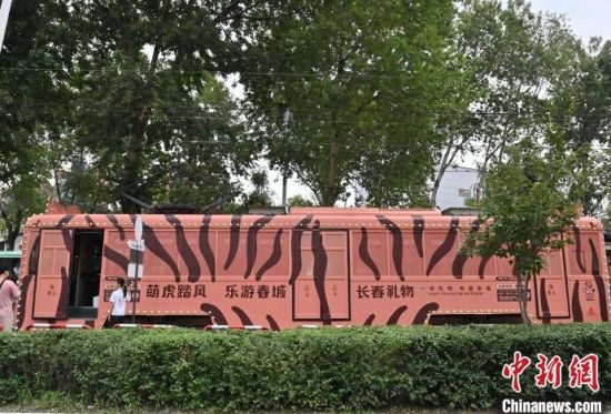 8月5日,吉林長春,游客在54路文旅東北虎專列內拍照。該專列是以“東北虎”為主題的有軌電車文旅專列,步入其中、綠意盈盈“森系”十足,吸引眾多游客前來打卡。(中新社記者 張瑤/攝)