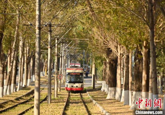 10月9日,吉林長(zhǎng)春,一輛有軌電車(chē)在泛黃的樹(shù)木中行駛,呈現(xiàn)出別有韻味的秋季景致,吸引游客打卡。中新社記者 張瑤 攝
