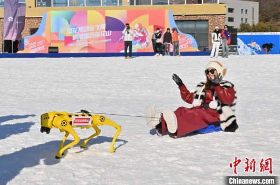 11月22日,在長春蓮花山滑雪場,機(jī)器狗在和小游客互動。當(dāng)天,長春蓮花山滑雪場開板,新上崗的6只機(jī)器狗憑借著新式“狗”拉爬犁出盡風(fēng)頭,惹得中外游客爭相合影。據(jù)悉,除了與游客互動,機(jī)器狗還能承擔(dān)物資運(yùn)送、急救和安全巡邏等多種服務(wù)任務(wù)。中新社記者 張瑤 攝