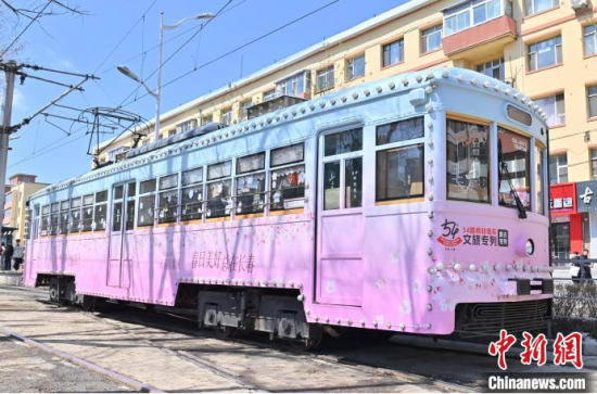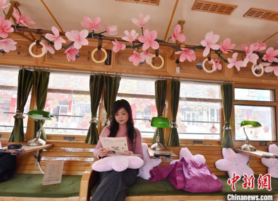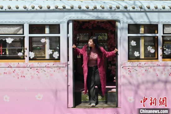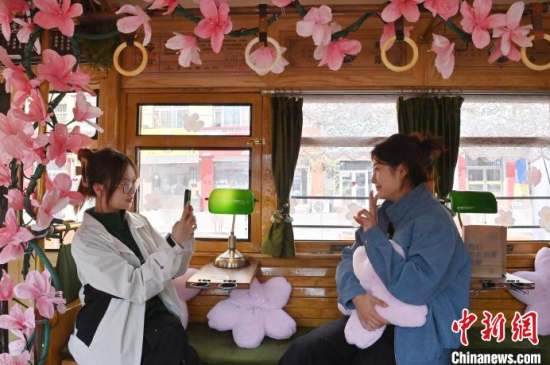 4月18日,吉林長(zhǎng)春,游客在54路文旅春日限定專列上拍照留念。該專列車廂內(nèi)外融入了桃花的設(shè)計(jì)元素,營(yíng)造出濃郁的春意,吸引了眾多游客前來打卡。中新社記者 張瑤 攝