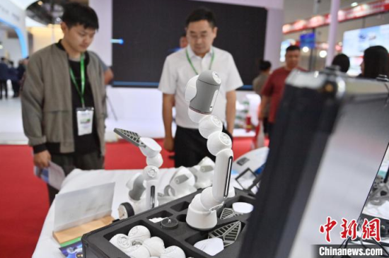 5月23日,第63屆高等教育博覽會(簡稱“高博會”)在長春開幕。本屆高博會由展覽展示與特色活動兩部分組成。其中,展覽展示面積12萬平方米,參展院校和企業(yè)6000余家。圖為高博會展覽現(xiàn)場,智能人形機器人吸引參觀者。中新社記者 張瑤 攝