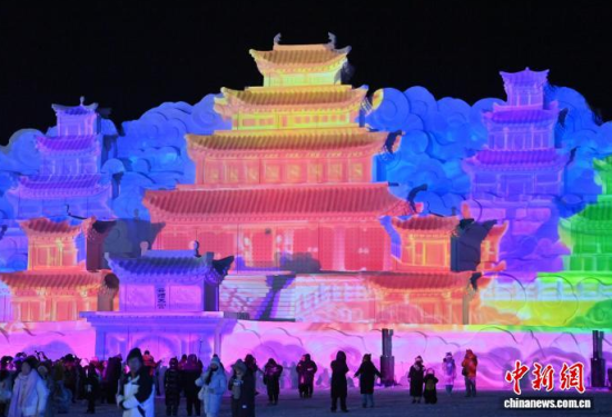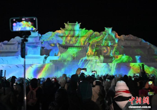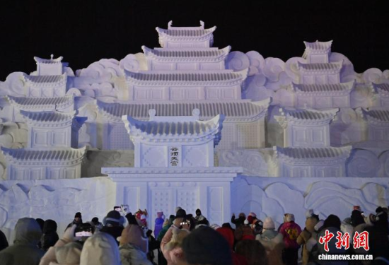 12月26日晚,吉林長白山,新落成的高30米、寬70米、用雪量10萬立方米的雪雕版“云頂天宮”正式點亮。這座以探險題材小說《盜墓筆記》為藍本雕琢的冰雪地標廣受書迷關(guān)注。中新社記者 張瑤 攝