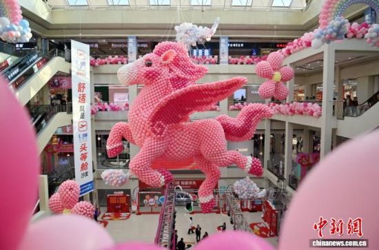 2月11日,吉林長(zhǎng)春一商場(chǎng)內(nèi)懸掛用8萬(wàn)個(gè)氣球組成的“瑞馬迎春”裝置,迎接丙午馬年春節(jié)。中新社記者 張瑤 攝