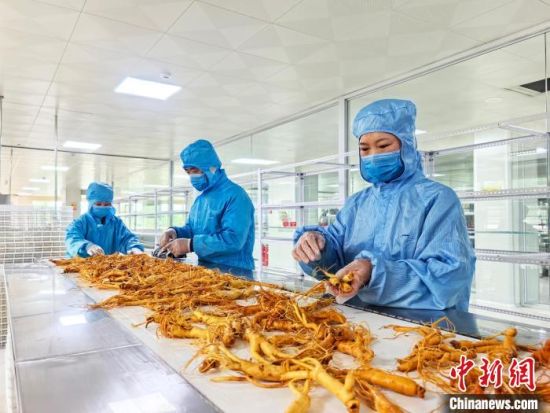 在人參加工車間里,工人們正在對人參進(jìn)行分選!∩n雁 攝