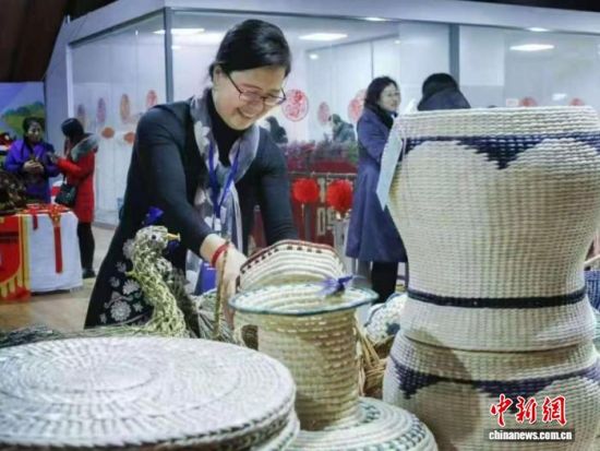 圖為曲秀杰攜草編作品參加展會。曲秀杰供圖