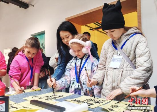 俄羅斯青少年在體驗(yàn)書法。李彥國(guó) 攝